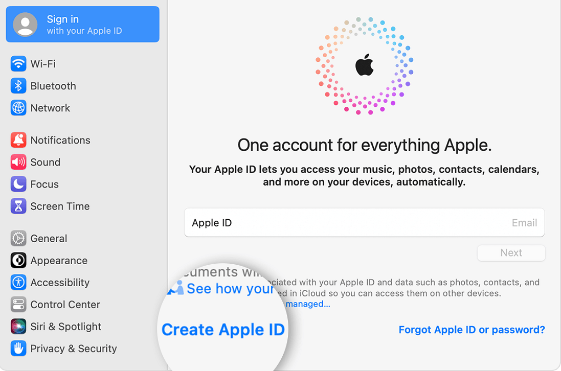 - در این مرحله یک پاپ آپ به شما نشان داده می شود که باید بر روی گزینه Create New Apple ID در بخش چپ و پایین کلیک کنید تا مرحله های ساخت اپل آیدی را تکمیل کنید.