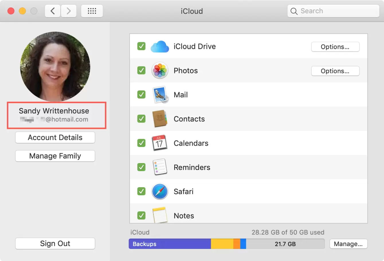 iCloud: از نوار منو، به Apple icon > System Preferences بروید، سپس iCloud را انتخاب کنید، Apple ID شما در سمت چپ ظاهر می شود.