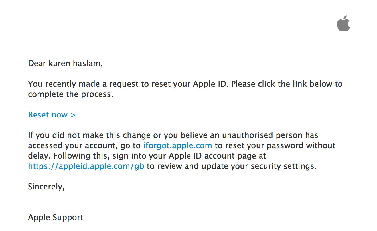 علاوه بر این، ممکن است ایمیلی از اپل دریافت کنید که نحوه بازنشانی رمز عبور Apple ID خود را توضیح می دهد. اگر هکری قصد تغییر رمز عبور شما را داشته باشد، ممکن است ایمیلی مشابه ایمیل زیر دریافت کنید.